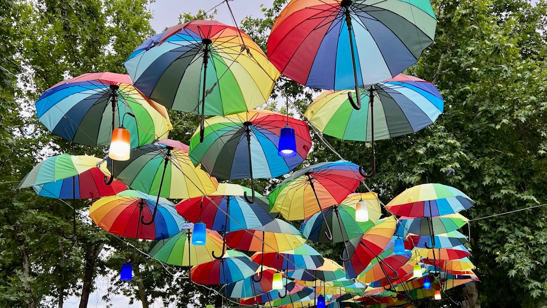 - paraplu’s met vrolijke prints, grote kappen en stevige frames tegen wind